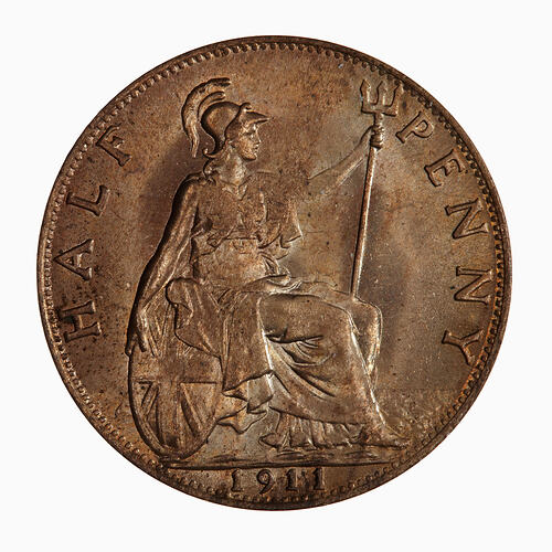 Britannia seated facing right on a rock wearing a helmet and flowing robes; she holds a trident and rests her right hand on a shield which bears the combined crosses of the Union Flag; around, HALF PENNY; in exergue, 1911