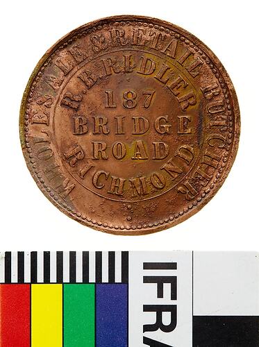 Obverse: R.B. RIDLER 187 BRIDGE ROAD RICHMOND WHOLESALE & RETAIL BUTCHER J. COVERLID Reverse: VICTORIA 1862 IN VINO VERITAS T. STOKES MAKER MEL.