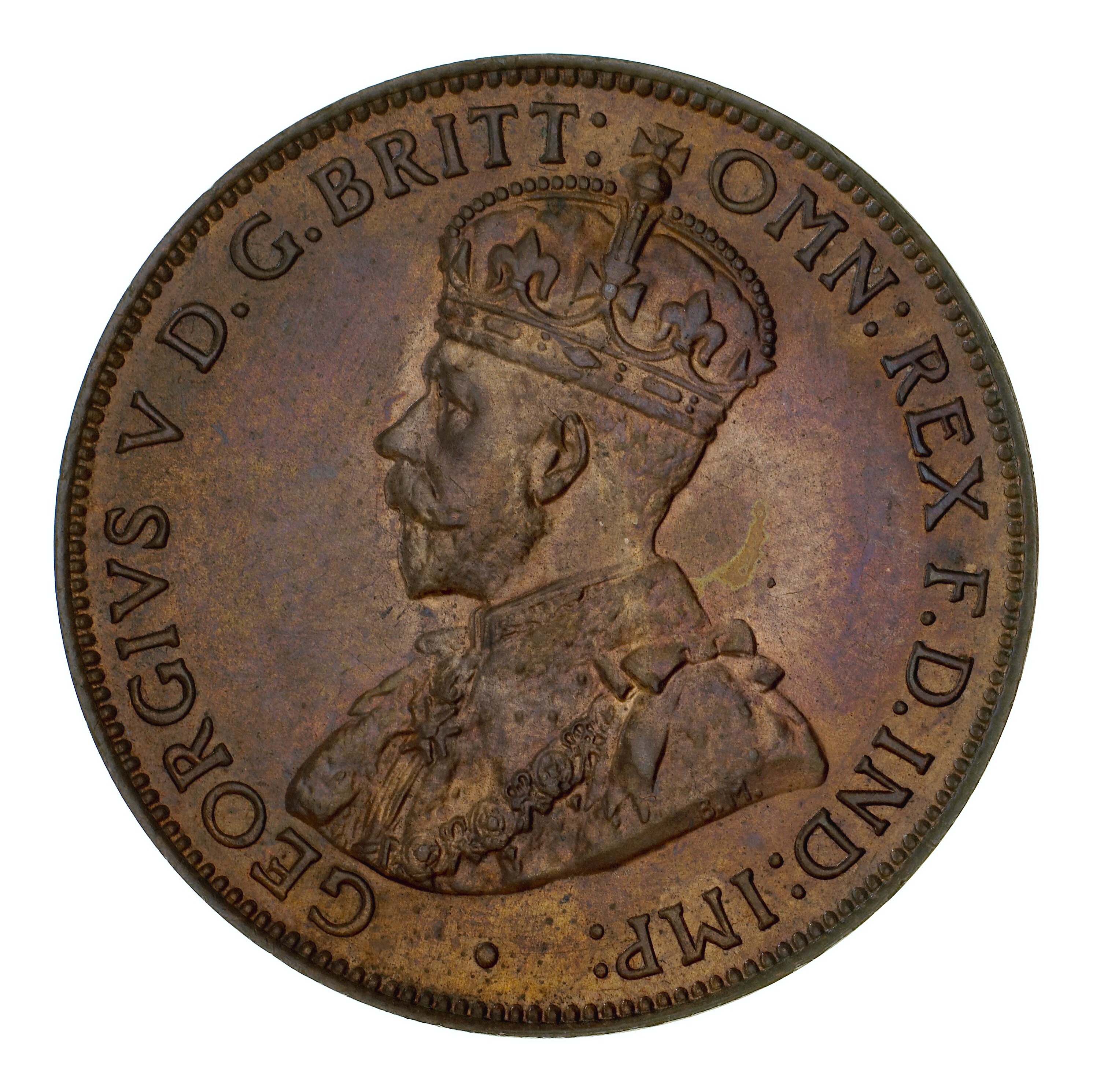 Crowned and robed bust of George V facing left; around, GEORGIVS V D.G. BRITT: OMN: REX F.D. IND: IMP: ; below bust in small lettering the artist's initials B.M.