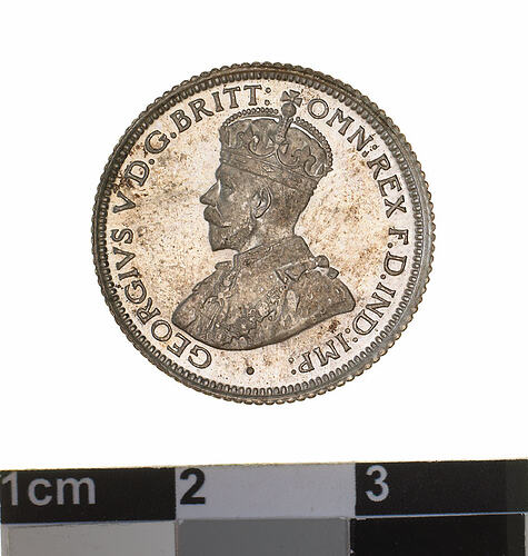 A silver coin (19 mm diameter with milled edge) featuring a crowned and robed bust of George V facing left; around, GEORGIVS V D.G. BRITT: OMN: REX F.D. IND: IMP: ; below bust in small lettering the artist's initials B.M.. The reverse features the Ensigns Armorial of the Commonwealth of Australia, as authorised by Royal Warrent 7th May 1908 - composed of a simple shield enclosing a cross of Saint George on which are five six-pointed stars, around the outside of which are six small escutcheons, i.e., small shields. The shield is supported by a kangaroo and an emu standing on a grassy mound. Above the shield a crest, the seven-pointed star of Federation on a wreath. Below on a ribbon the motto ADVANCE AUSTRALIA is inscribed. Around above, SIXPENCE and below, between arrow heads, the date, 1922.