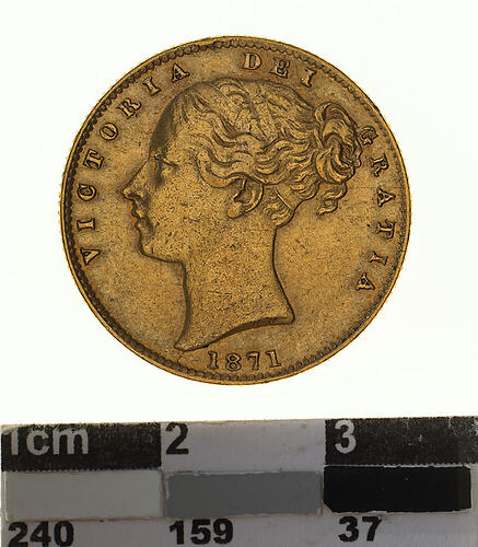 A gold coin (21.5 mm diameter with milled edge) featuring a head of Queen Victoria facing left with a plain band and fillet in her hair, the date, 1871 below; the artist's initials, W.W., in incuse letters on neck truncation; around, VICTORIA DEI GRATIA. The reverse features the royal shield of arms, garnished and crowned with the mint mark S below the crossing point of the wreath and above the rose; around, BRITANNIARUM REGINA FID: DEF: