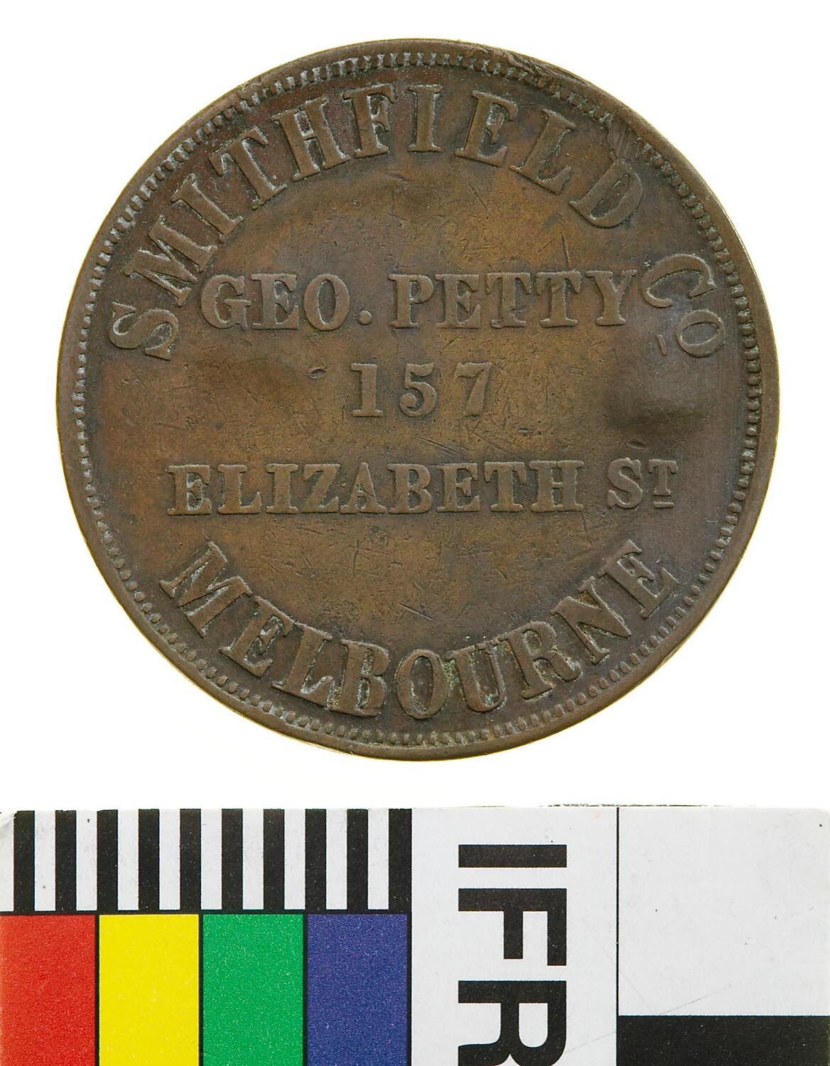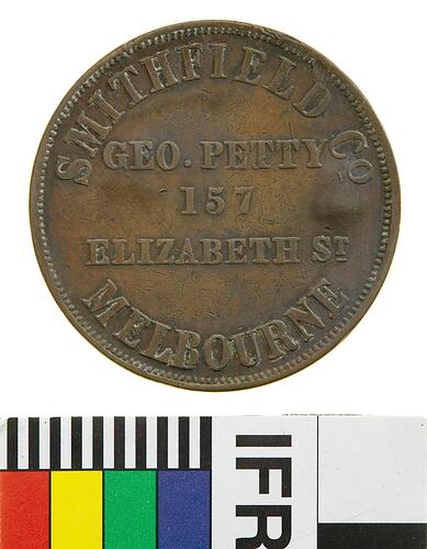 A round copper token (34 mm diameter) featuring the name, company name and address of the issues: Geo. Petty, Smithfield & Co., 157 Elizabeth Street Melbourne. The reverse features a female figure representing Justice standing facing left. She wears a blindfold and extends a balanced set of scales with her right hand. With her left she holds a short staff. She wears an ancient-style of flowing dress bound at the waist; around above, VICTORIA. This token has been surcharged VZ