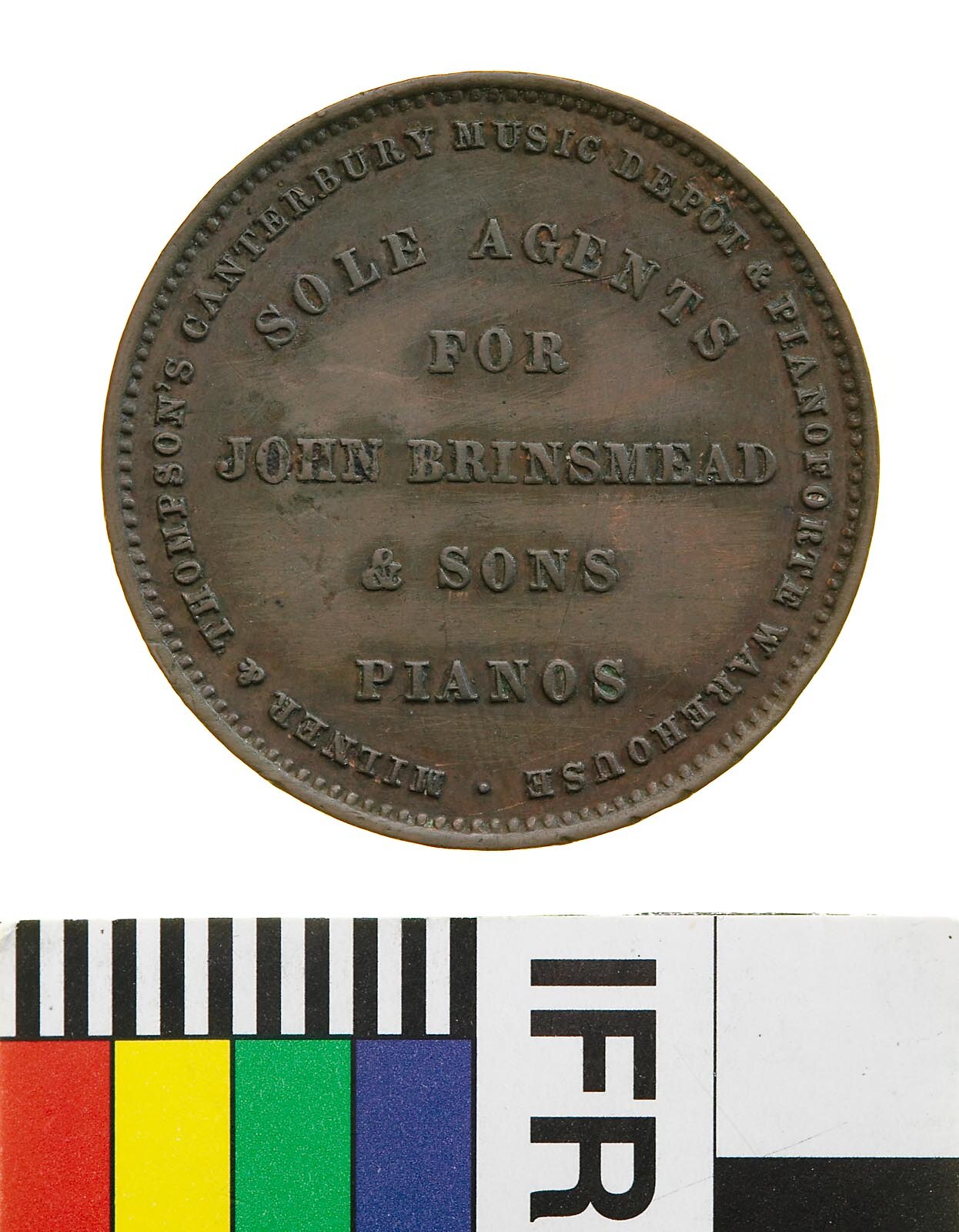 Copper One Penny Token, minted by Stokes & Martin, Melbourne. Issued by Milner & Thompson, Canterbury Music Depot, Christchurch, 1881. Surcharged 'S'. Milner & Thompson's Music store, the Canterbury Music Depot, was opened in 1874 by Robert Thompson, some time soon afterwards he took John Milner into partnership and they worked together for 21 years. When Milner retired Thompson continued in the business until he passed it to his sons in 1907. The business was bought by Charles Begg and Co. in 1920, and was still a going concern in 1950. Milner & Thompson were the last issuers of tokens in New Zealand. The firm had a number of novel advertising schemes, in addition to the tokens. They installed a 'phantom piano' on the ground floor, which was set up to give the appearance of being played, while it was in fact being operated from a keyboard and set of pedals installed in the basement below. Thompson also ran a Booking Office for plays from the store from 1881, the first production advertised being staged by the Montague-Turner Opera Co. of Sydney.