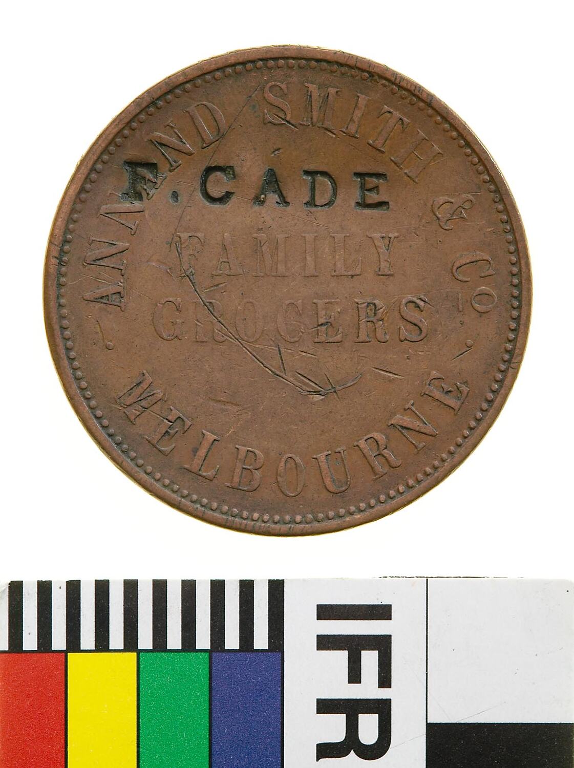 Copper one Penny Surcharged Token, minted by Heaton & Sons in Birmingham. Issued by Annand Smith & Co, Family grocers, in Collins Street, Melbourne. This token has been surcharged 'F. Cade', circa 1856. Annand Smith & Co issued Australia's first circulating copper tokens, on 20 October 1849. In 1949 the Numismatic Association of Victoria issued a medal to commemorate the 100th anniversary of that token. The partnership between Annand and Smith was over by 1852.