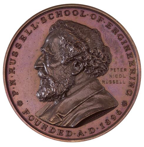 Bust of P.N. Russell facing left, under shoulder truncation ALLAN WYON SC.; around, P.N. RUSSELL . SCHOOL . OF . ENGINEERING FOUNDED. A.D.1896; behind head, PETER NICOL RUSSELL