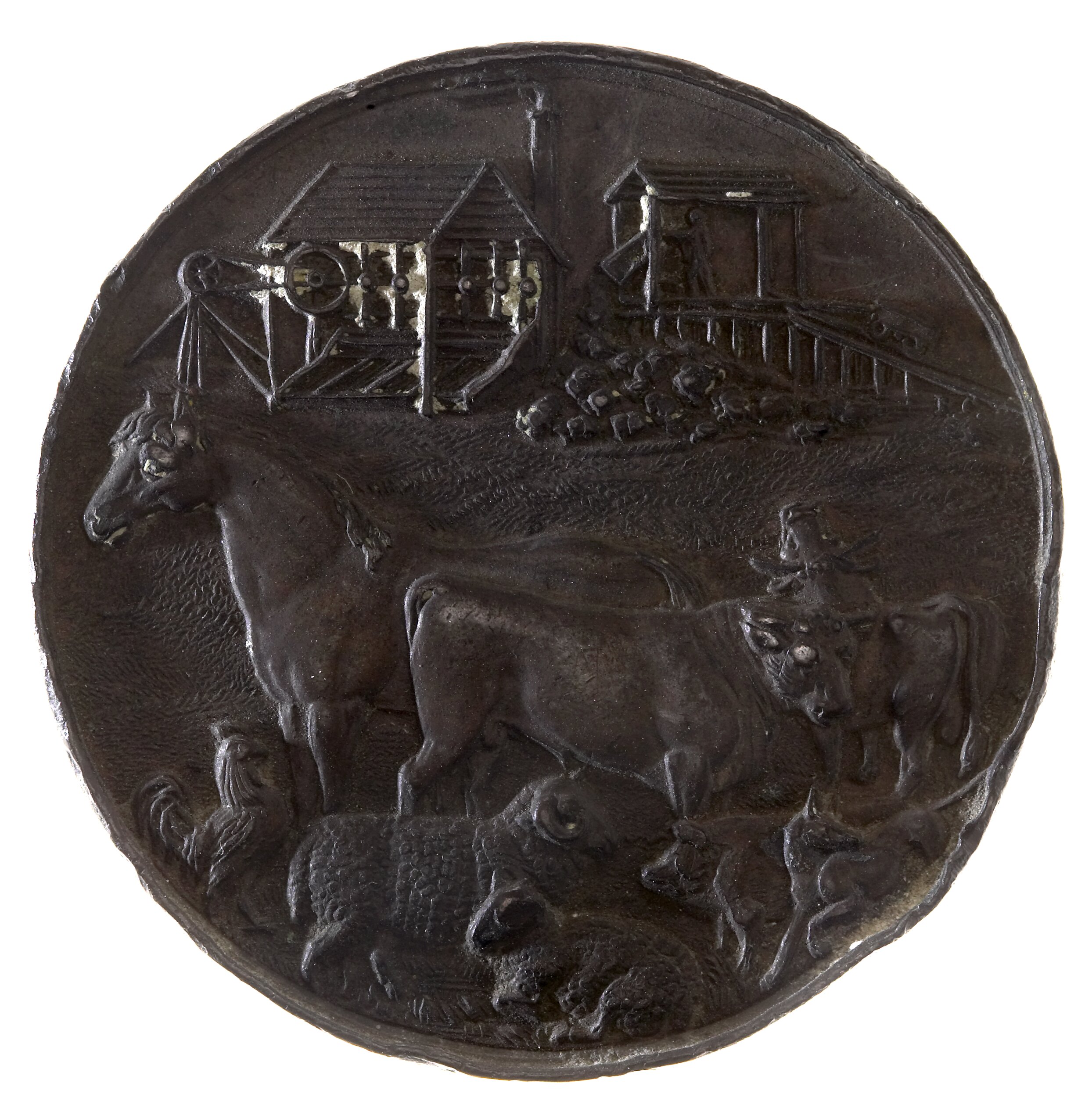 In the foreground a grouping of farm animals: horse, cow, bull, rooster, sheep, pig and dog, and in the backgound, mining operations: a crusher and man emptying ore,in the backgound. the artist's initials, R.C. below the start of the mining ramp.