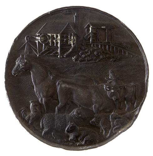 An bronze prize medal (45 mm diameter) featuring farm animals:horse, cow, bull, rooster, sheep, pig and dog in the foreground, and mining operations: a crusher and man emptying ore, in the backgound together with the name of the society and details of the winner on the reverse within a tropical horticultural wreath engrave on a central shield above a plough and below a rising sun.
