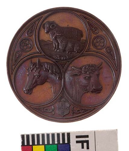 An bronze prize medal (45 mm diameter) featuring three circles containing a horse's head; a bull's head and the third, two sheep, ram standing and ewe sitting; together with the name of the society and space for details of the winner on the reverse within an olive wreath