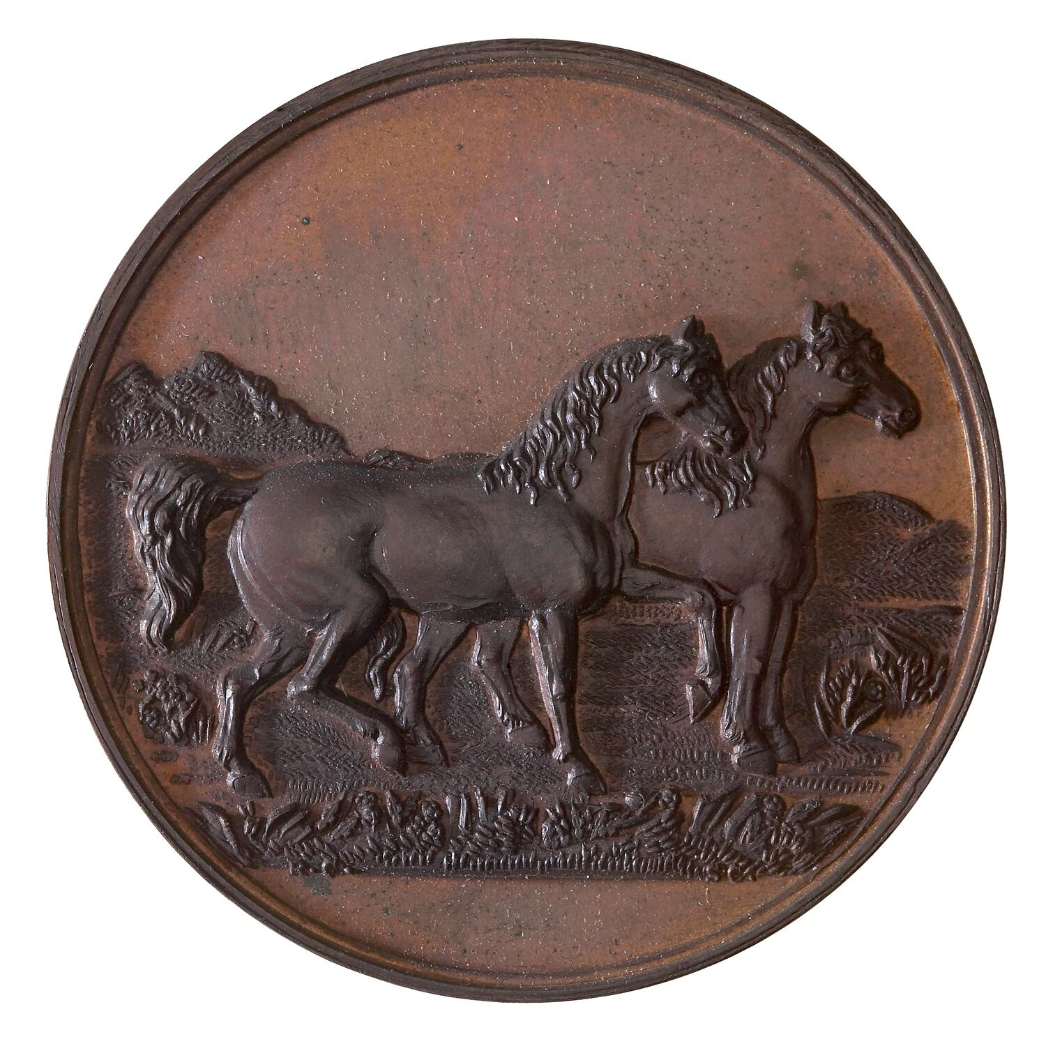 Other Details: General purpose agricultural bronze prize medal, including an image of two horses. It was made around 1875. Both dies were cut by an artist identified as 'R.C.'.
