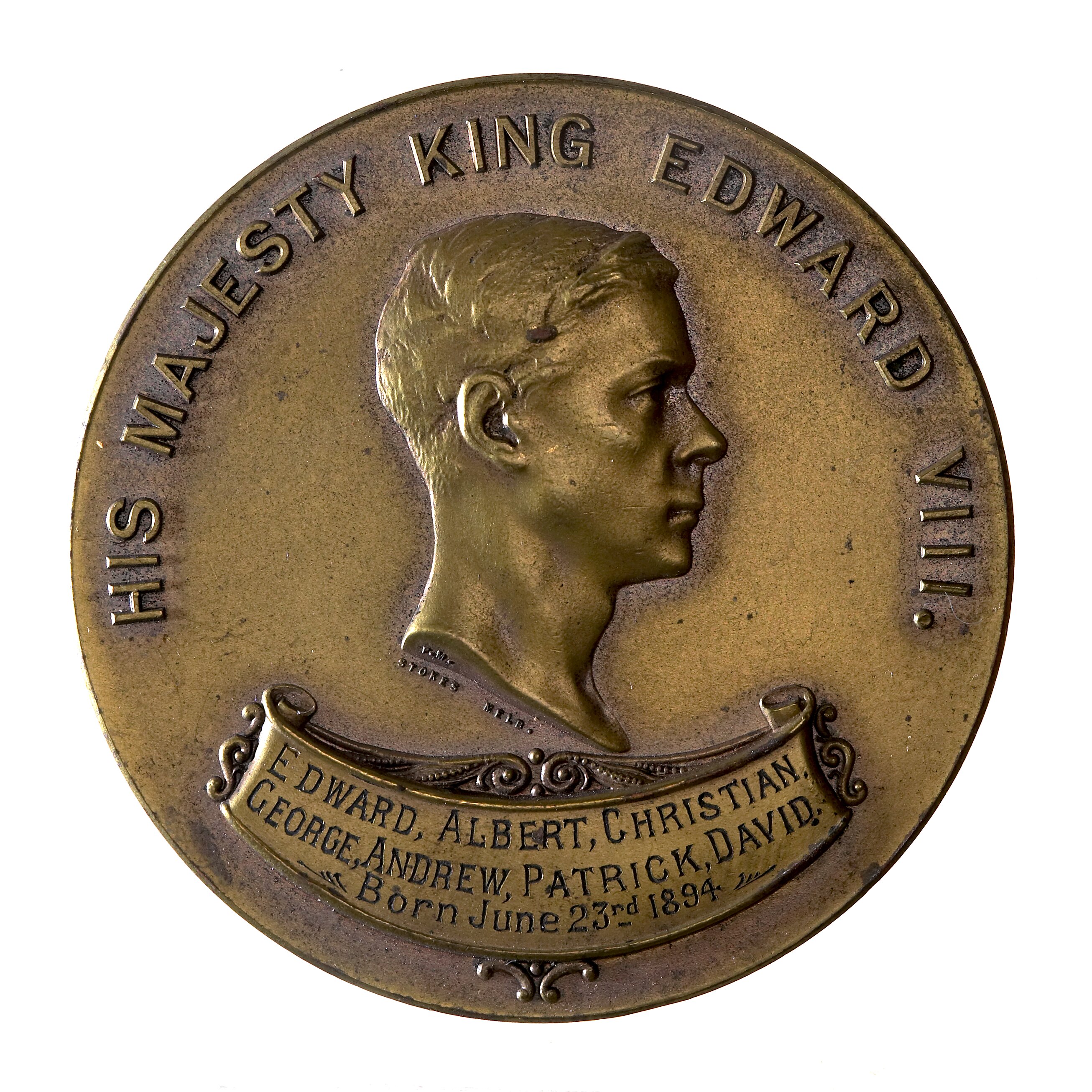 Head of Edward VIII bare, facing right; around above, HIS MAJESTY KING EDWARD VIII. ; below, engraved on scroll EDWARD, ALBERT, CHRISTAN, / GEORGE, ANDREW, PATRICK, DAVID, / BORN JUNE 23RD 1894; in small letters below truncation, STOKES MELB.
