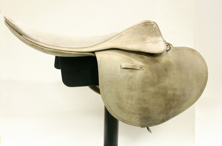 Pale leather saddle worn by Phar Lap during training and trackwork. It was retained by family of his trainer Harry Telford family, and was amongst a number of items donated to the museum by them in the 1990s.