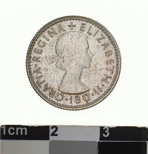 A silver coin (19 mm diameter with milled edge) featuring a laureate head of Elizabeth II facing right; around, + ELIZABETH . II . DEI . GRATIA . REGINA ; below bust in small lettering the artist's initials H.P.. The reverse features the Ensigns Armorial of the Commonwealth of Australia, as authorised by Royal Warrent 7th May 1908 - composed of a simple shield enclosing a cross of Saint George on which are five six-pointed stars, around the outside of which are six small escutcheons, i.e., small shields. The shield is supported by a kangaroo and an emu standing on a grassy mound. Above the shield a crest, the seven-pointed star of Federation on a wreath. Below on a ribbon the motto ADVANCE AUSTRALIA is inscribed. Around above, SIXPENCE and below, between arrow heads, the date, 1954.