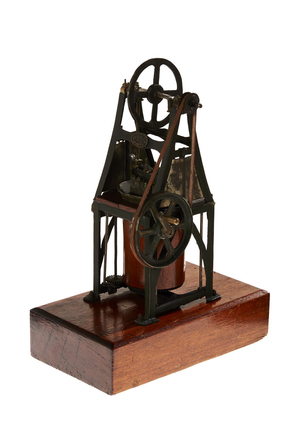 Model is mounted on a dark brown polished wooden block. Large handwheel on one side rotates a drum beneath the working table on which there is a metal pan. A pulley mounted overhead operates the up and down motion of the chopping blades in the pan via a belt (missing) that would have been attached to the large flywheel connected to the handwheel. Maker's plate on the front of the model frame. Yellow card tag with handwritten text is attached with twine.