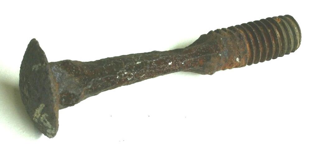 Iron bolt with a round head, a squared, tapering shaft and threaded end. The bolt is rusted and corroded.