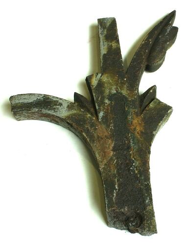 Broken piece of cast metal shaped as a finial, comprising five extended points. The surface has rusted, and there is grey paint residue.