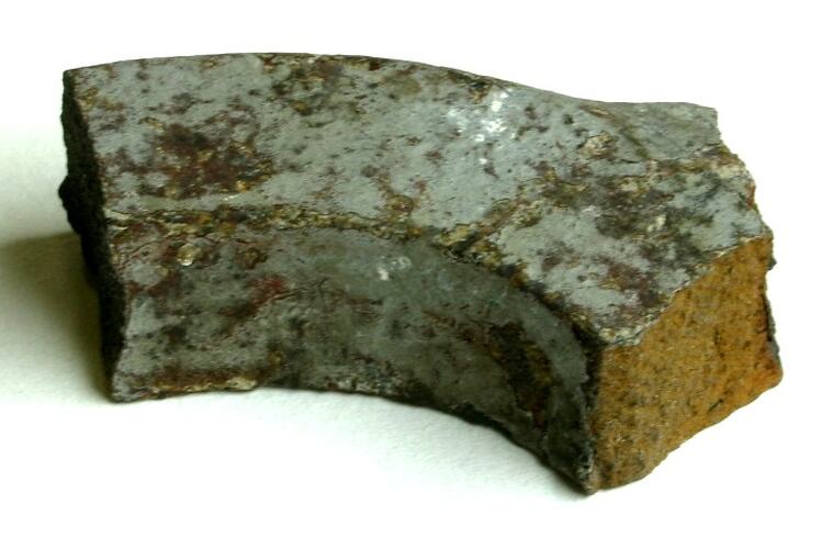 Broken section of cast, decorative metal. It is curved in shape and flares slightly at one end. The number '4' is handwritten in black ink at the flared end. The exposed ends show the metal to be dark grey with some rust colouring at one end. Remnants of silver paint are on the surface.