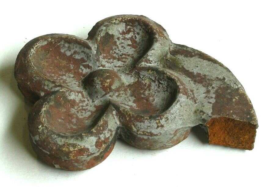 Broken decorative metal section in the shape of a rosette with four round petals and a central raised point. Small section of arm extends from side where rosette was broken off. The exposed ends show the metal to be rust-coloured. Remnants of silver and white paint are on the surface. Surface has some rust also.