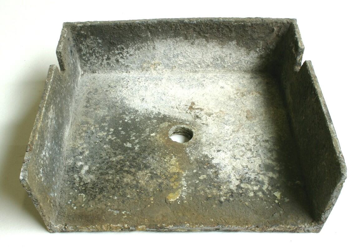 Rectangular piece of lead with three raised sides and a hole through the centre. Two sides have a small section cut out. Attached to the underside is an octagonal sheet of lead with a hole in the centre. Dents, flaking paint, dirt and some rust are on the surface. White, powder-like residue on surface.
