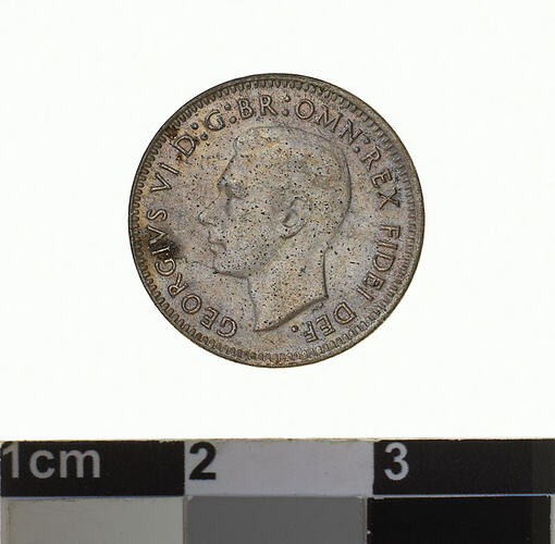 Obverse: GEORGIVS VI D: G: BR: OMN: REX F: D: IND: IMP. Reverse: THREE PENCE 1951 AUSTRALIA K G