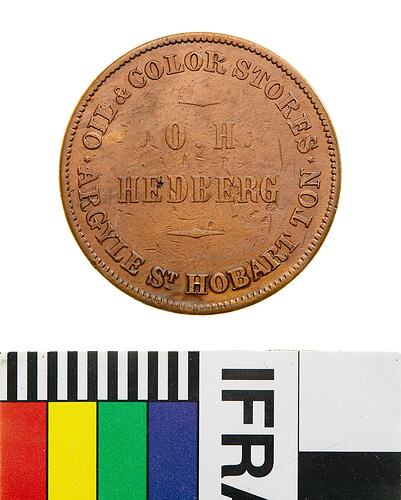 Copper Halfpenny token, minted by W.J. Taylor of London, circa 1860. Issued by O.H. Hedberg, owner of Oil & Colour Stores, in Hobart, Tasmania.