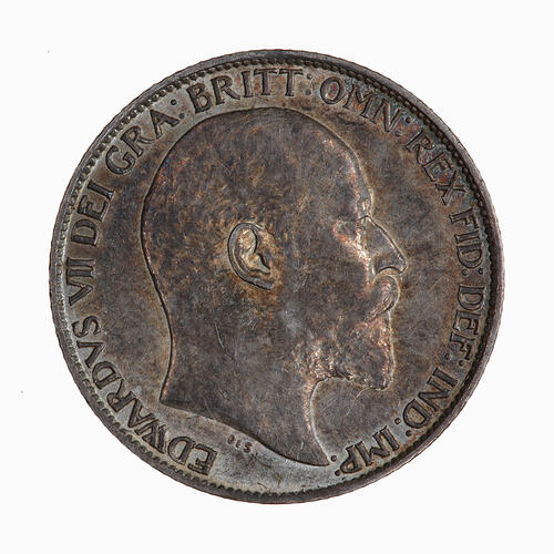 Bare head of the King facing right; below in small letters De S. (for G.W. De Saulles Mint Engraver); around, EDWARDVS VII DEI GRA: BRITT: OMN: REX FID: DEF: IND: IMP: