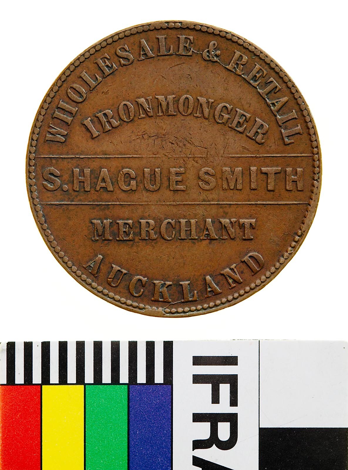 A round copper token (34 mm diameter). The token features the name, address and business of the issuer: S. Hague Smith, Auckland, wholesale and retail Ironmonger. The reverse features a profile head of Prince Albert and gives the dates of his birth and death - August 26 1819 to 14 December 1861.