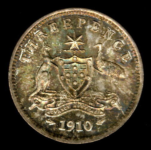 (edge) Crowned bust of Edward VII facing right, around, EDWARDVS VII D:G:BRITT:OMN:REX F:D:IND:IMP:+ (obverse) Australian Arms with ADVANCE AUSTRALIA on wreath; above THREEPENCE; below, 1910 (reverse)
