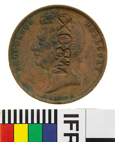 Head of Professor Holloway facing left with J. MOORE (the maker's name) incuse on neck truncation; around, PROFESSOR HOLLOWAY; below, LONDON, surcharged W. BOX