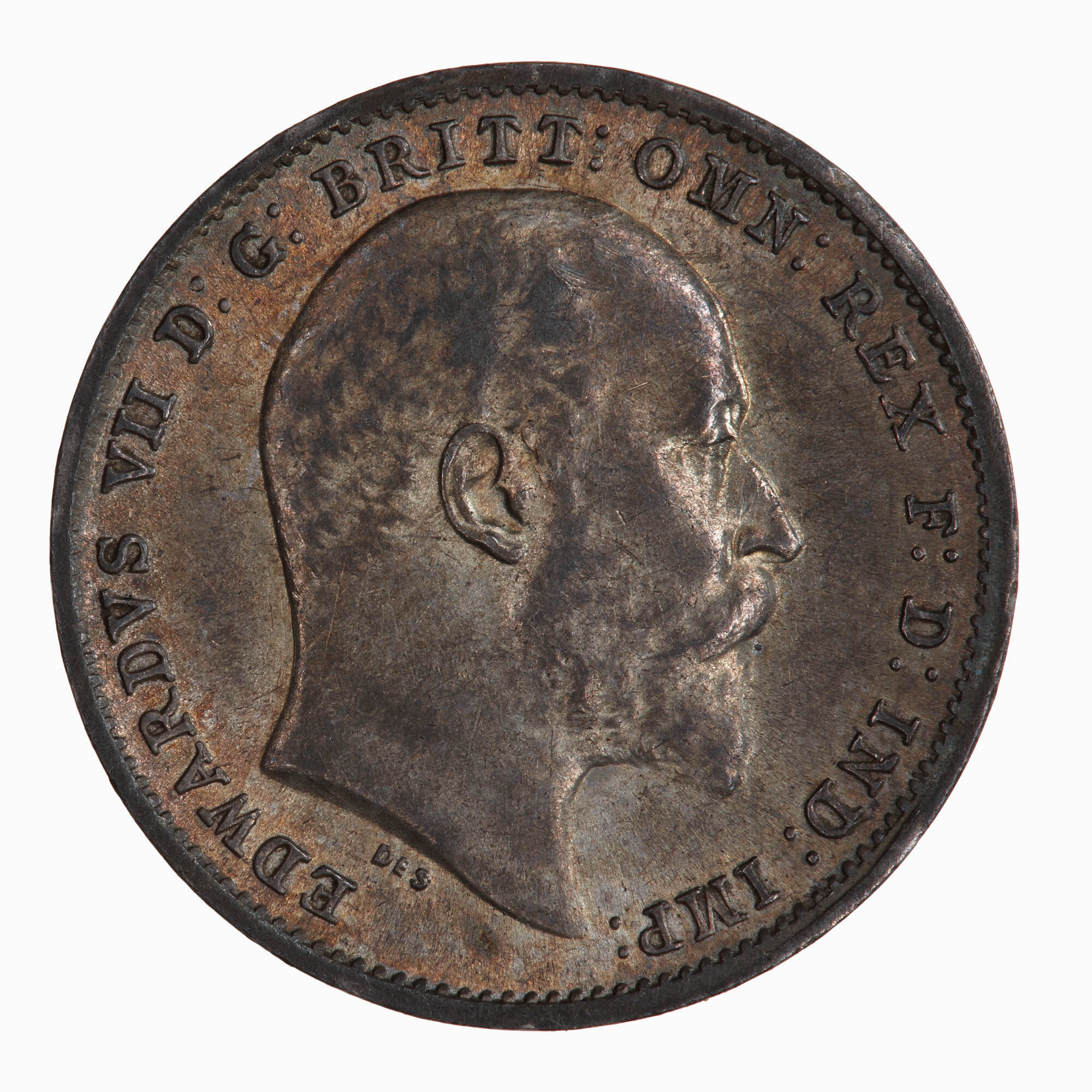 Bare head of the King facing right; below in small letters De S. (for G.W. De Saulles Mint Engraver); around, EDWARDVS VII DEI GRA: BRITT: OMN: REX FID: DEF: IND: IMP: