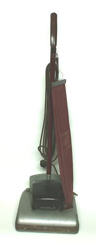 Vacuum cleaner featuring a square, galvanised steel head with rubber buffer at the front, maroon bakelite cover on the top, and a button and lever to operate. Underneath are round, black-bristled brushes and two wheels. A tubular handle is attached, painted maroon with a maroon bakelite handle and switch. The dust bag is of maroon ribbed cloth, affixed to the handle with a spring, with a metal casp to close and lettering on one side. An electric cord covered with maroon plastic is wrapped around two hooks on the handle.