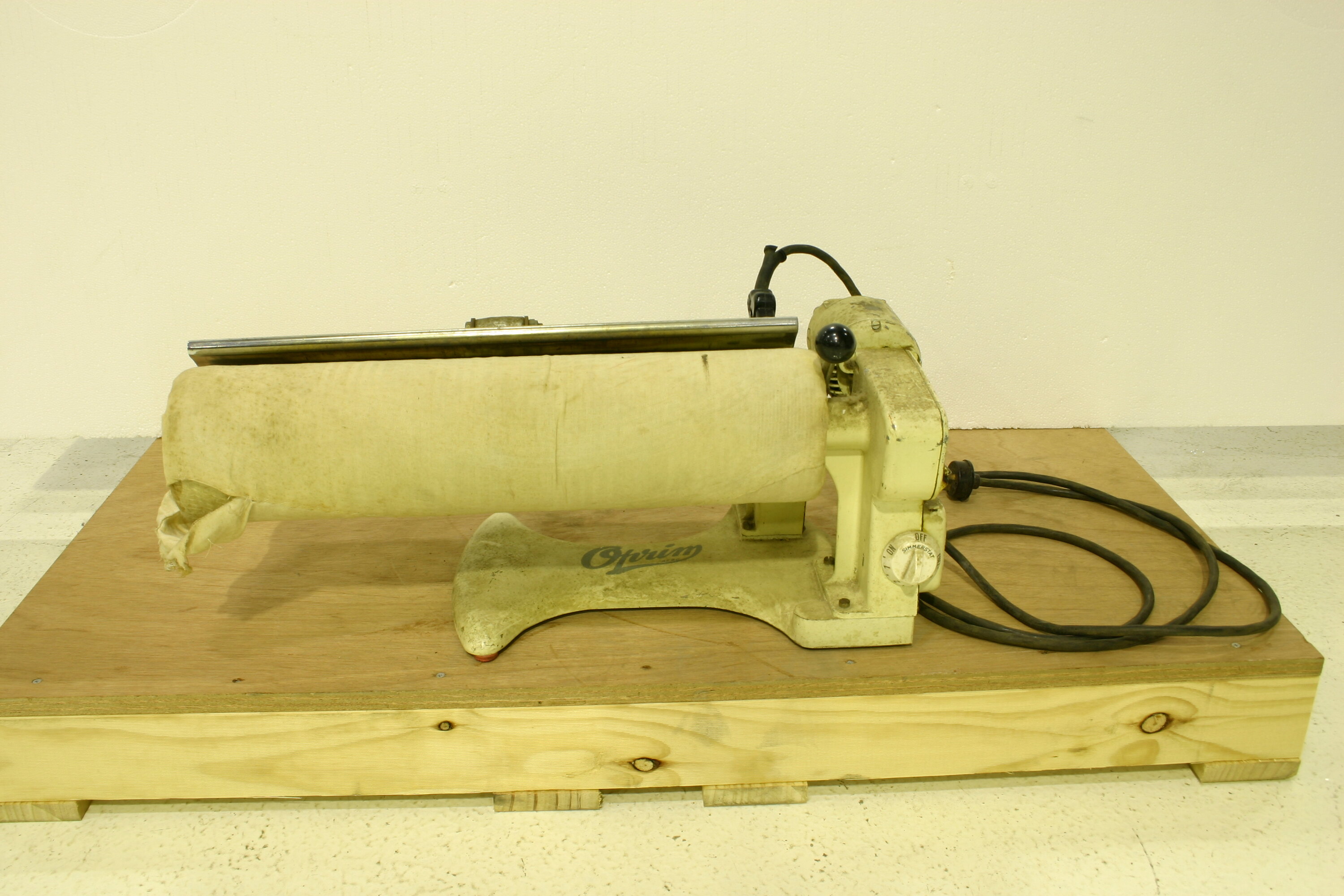 BASE: "Oprim (in script)/ REGD" FRONT: moulded on outer rim of dial "OFF FULL 4 3 2 1 ON"; on inner rim "SIMMERSTAT/ TRADE MARK". SIDES: on disk "OPRIM/ POWER ROTARY IRONING MACHINE/ AIRCRAFT & GEN. ENG. CO LTD/ EDGWARE/ PROV. PAT. NO/ 3048/1949 3049/1949 / 1461/1950 / AUSTRALIAN PAT./ APPLICATION/ NOS. / 32200 / 32213/ TOTAL LOADING 1,100 WATTS/ FOR USE ON/ A/C 230/50 V. 40/60 CYCLES" BACK: on power supply plug "CLIPSAL"; on plug to iron "Goltone" (in script).