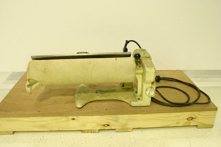 Electric rotary ironer, Oprim, cream, bench top. It was made by Aircraft and General Engineering Co. Ltd., Edgware, circa 1950. Patents for this iron were applied for in 1949 and 1950, thus providing a date of manufacture.
