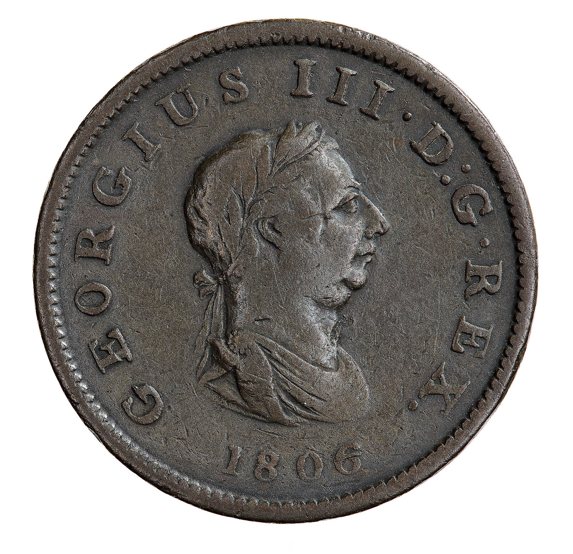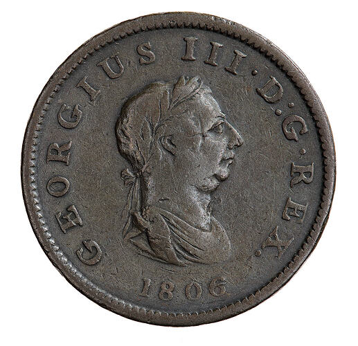 Laureate and draped bust of the King facing right; around, GEORGIVS III D: G: REX; below, 1806