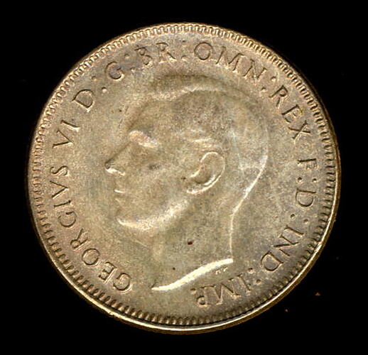 Milled (edge) Bare head of George VI left; around, GEORGIVS VI D:G:BR:OMN:REX F:D:IND:IMP: Tiny H.P. below neck (obverse) Rams head; around, AUSTRALIA * . SHILLING . 1946 * (reverse)