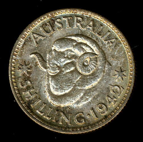 Rams head; around, AUSTRALIA * SHILLING . 1942 * Tiny letter S on rams neck.