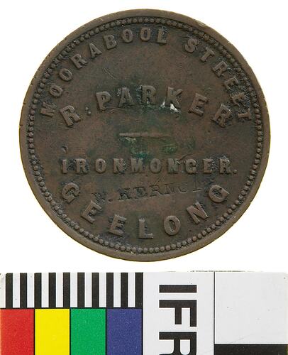 A copper token (34 mm diameter) featuring the name, address and business of the issuer: R. Parker, Moorabool St. Geelong, Ironmonger and on the reverse, a female figure representing Justice standing facing left. She wears a blindfold and extends a balanced set of scales with her right hand. With her left she holds an inverted cornucopia from which fruits flow onto the ground. She wears an ancient-style of flowing dress bound at the waist, her left arm is draped to near the elbow while drapery falls from her extended arm to below the horizon line behind; around above, AUSTRALIA. A three-masted sailing ship on horizon at left of token. Surcharged W. KERNOT