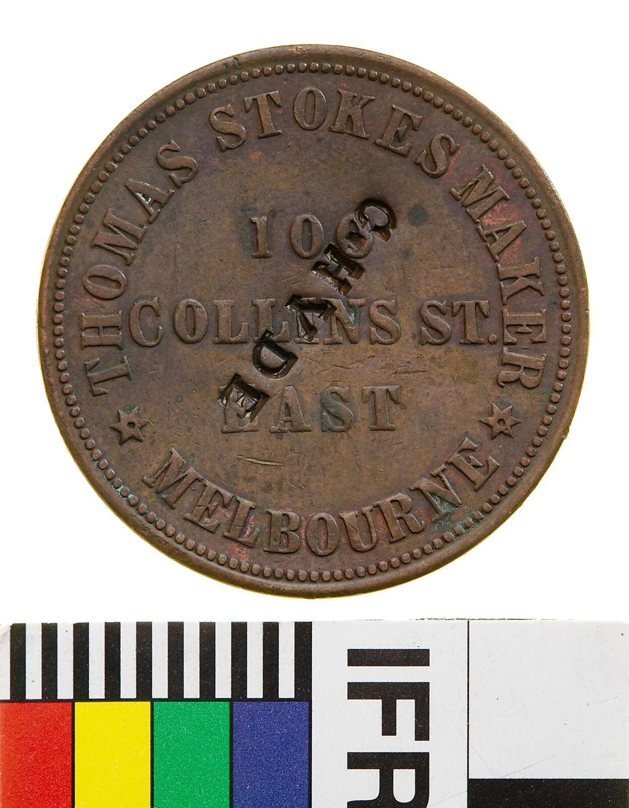 Copper one Penny token, minted by Thomas Stokes of Melbourne. Issued by Thomas Stokes, Diesinker, Token Maker & Medallist, Melbourne, in 1862. Surcharged G. HYDE. This token is one of the large number of anonymous tokens struck by Stokes late in 1862. Anonymous issues were manufactured employing two stock dies. Thomas Stokes migrated to Australia in search of gold in the 1850s, being unsuccessful he returned to his trade as a die-maker and button maker. In 1857 Stokes acquired a press from W.J. Taylor and began to mint large numbers of tradesmen's tokens. He also commenced the Australian Medallic Issues. In 1873 Stokes took a partner, Martin, and the business was re-named Stokes & Martin. In 1893 a disastrous fire damaged a large portion of the business, Martin had forgotten to renew the fire insurance policy, and the partnership was dissolved as a result. Stokes rebuilt the business as Stokes & Son. The business became a proprietary concern in 1911, re-named Stokes & Son Pty Ltd. In 1935 the business moved to Brunswick, and in 1962 Stokes became a public company, renamed Stokes (Australasia) Pty Ltd. Today the business is located in Ringwood.