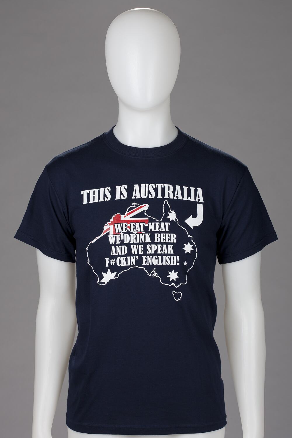 Navy blue t-shirt with the Australian flag within a map of Australia and the slogan 'This Is Australia, we eat meat, we drink beer and we speak f#ckin' English!' It is one of three t-shirts which comprise a 'Hardcore Aussie Pride' pack sold online in 2009 and in a Darwin shop prior to Australia Day 2009.
