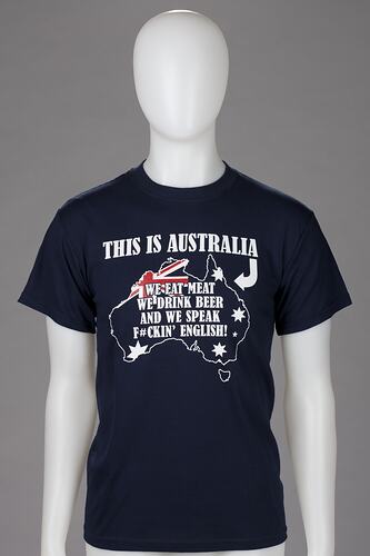 Printed on front: 'This Is Australia, we eat meat, we drink beer and we speak f#ckin' English!'
