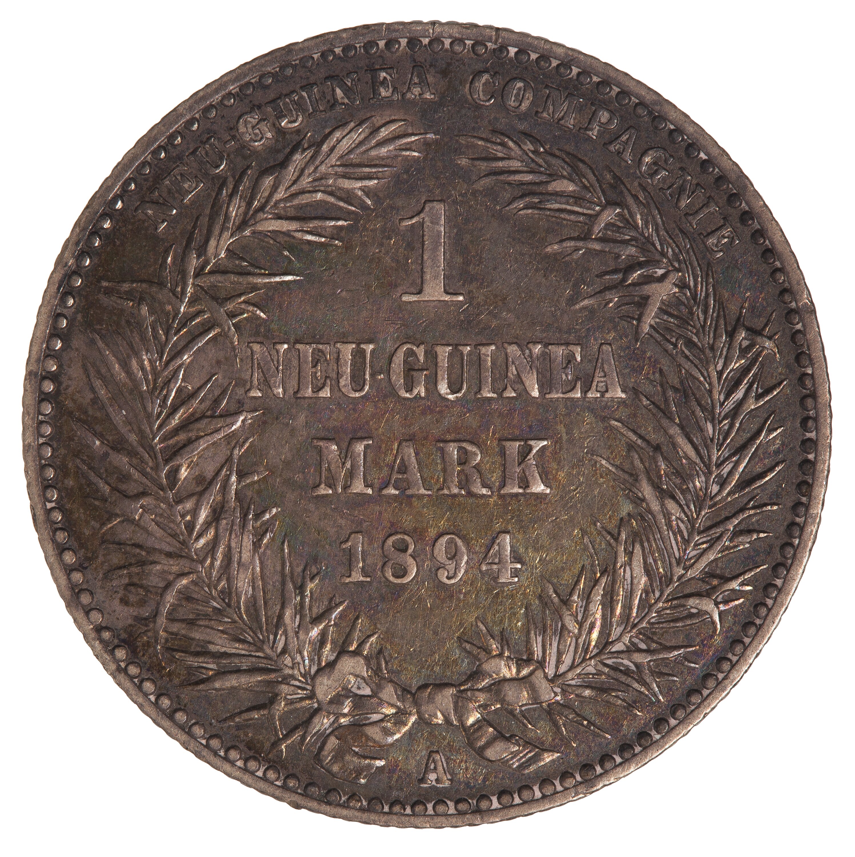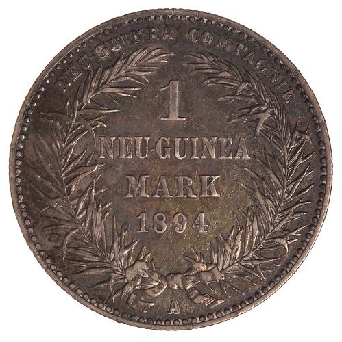 Within an open wreath, 1 / NEU-GUINEA / MARK / 1894; around above, NEU GUINEA COMPAGNIE; below, the mint mark A