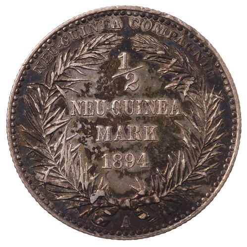 Within an open wreath, 1/2 / NEU-GUINEA / MARK / 1894; around above, NEU GUINEA COMPAGNIE; below, the mint mark A