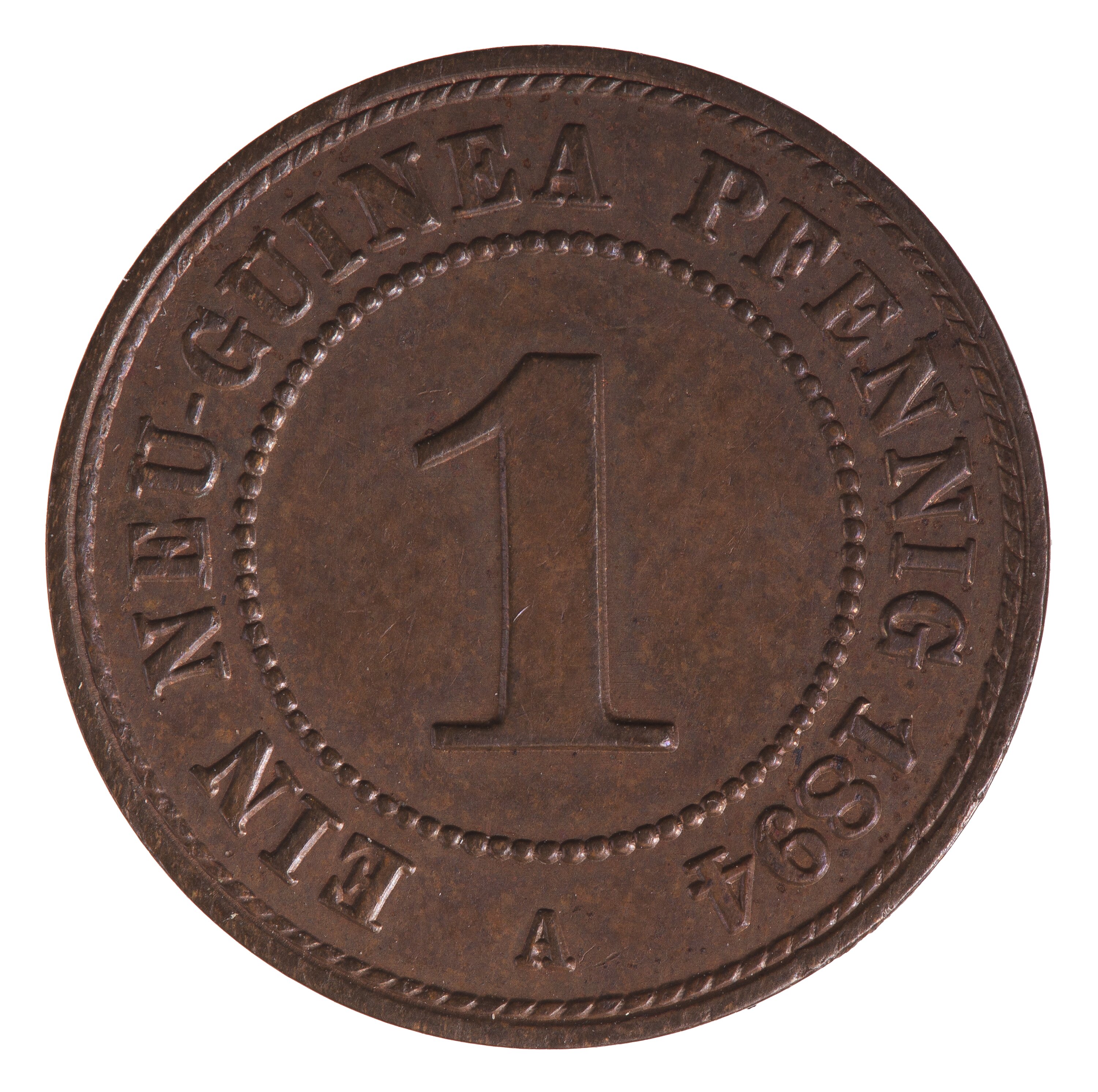 Bronze 2 Pfennig coin issued by the German New Guinea Company. Struck at the Berlin mint, Germany. This coin was issued by the German New Guinea Company. This was a Chartered Company which had been formed in 1884 in Berlin to colonise and profit from north-eastern New Guinea. It had found it necessary to import workers from Java (who wanted payment in Dutch guilders), China and Japan (who wanted payment in Mexican dollars, a standard trad coin in Asia at that time). German, and to a lesser extent British coins was also in use in the area. To simplify this situation the Company sought permission to strike its own coins in 1891. Permission was not granted until 1894 with the stipulation that each denomination (excluding the bronze) was to match it's German Imperial equivalent. The coins were not however to bear the head of the German Emperor nor the German Eagle - they were the issue of the Company. The dies were prepared (engraved by Emil Weigand) and coins struck at the Berlin Mint. When they arrived in New Guinea all non German coins were withdrawn from circulation (the German 3 Mark and 20 Pfennig denominations were also excluded from circulation). No further production of coins was required as administration of the region was handed to the German Imperial Government in 1899, with German Imperial coins being imported. The Company coins ceased to be legal tender after 15 April 1911.
