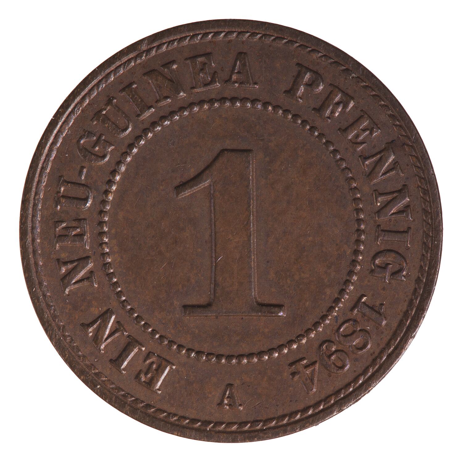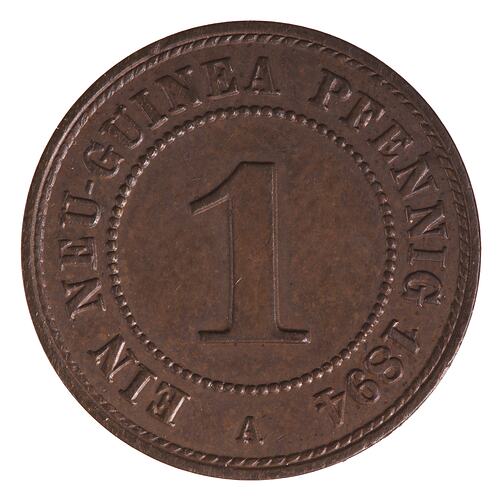 At centre within circle of beads, 1; around, NEU-GUINEA PFENNIG 1894 A