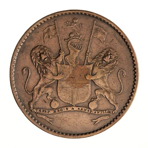Shield quartered with arms of France and England in the first quarter, with crest of helmet on which a lion rampant holding an imperial crown; two lions rampant as supporters each with a banner and inner foot on globe; below, incuse on ribbon, AUSP. REGIS & SENATUS ANGLIAE