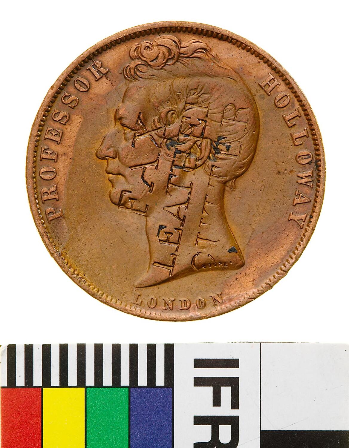 Head of Professor Holloway facing left with J. MOORE (the maker's name) incuse on neck truncation; around, PROFESSOR HOLLOWAY; below, LONDON, surcharged in three lines FAX / LEATHER / CUTTER