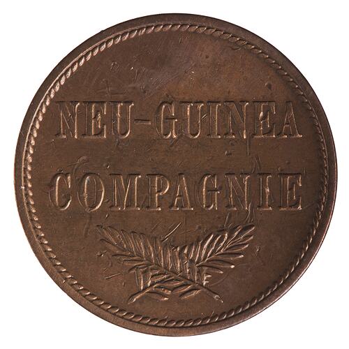 Silver 2 Pfennig coin issued by the German New Guinea Company. Struck at the Berlin mint, Germany. This coin was issued by the German New Guinea Company. This was a Chartered Company which had been formed in 1884 in Berlin to colonise and profit from north-eastern New Guinea. It had found it necessary to import workers from Java (who wanted payment in Dutch guilders), China and Japan (who wanted payment in Mexican dollars, a standard trad coin in Asia at that time). German, and to a lesser extent British coins was also in use in the area. To simplify this situation the Company sought permission to strike its own coins in 1891. Permission was not granted until 1894 with the stipulation that each denomination (excluding the bronze) was to match it's German Imperial equivalent. The coins were not however to bear the head of the German Emperor nor the German Eagle - they were the issue of the Company. The dies were prepared (engraved by Emil Weigand) and coins struck at the Berlin Mint. When they arrived in New Guinea all non German coins were withdrawn from circulation (the German 3 Mark and 20 Pfennig denominations were also excluded from circulation). No further production of coins was required as administration of the region was handed to the German Imperial Government in 1899, with German Imperial coins being imported. The Company coins ceased to be legal tender after 15 April 1911.