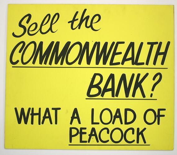 Placard with the slogan 'Sell the Commonwealth Bank? What a Load of Peacock' used circa 1990. This placard was used to rally against the proposed privatisation of the Commonwealth Bank by the Australian Liberal Party during the 1990 federal election where Andrew Peacock was leader of the Liberal Party.