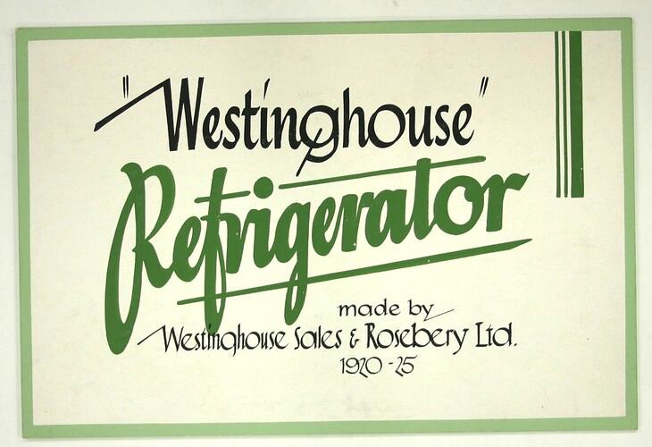 Display label of thick card painted white. The text is hand painted in black and green, and reads "Westinghouse Refigerator made by Westinghouse Sales & Rosebery Ltd. 1920-25", with a light green border surrounding. A card stand is adhered to the reverse.