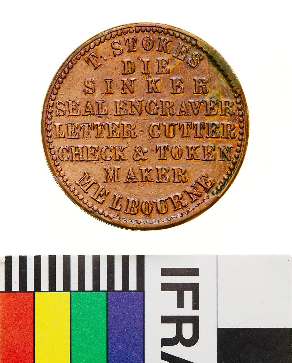 Copper Halfpenny token, minted by Thomas Stokes of Melbourne, circa 1862. Issued by Thomas Stokes, Diesinker, Token Maker & Medallist, Melbourne. This token is one of the large number of anonymous tokens struck by Stokes late in 1862. Anonymous issues were manufactured employing two stock dies. Thomas Stokes migrated to Australia in search of gold in the 1850s, being unsuccessful he returned to his trade as a die-maker and button maker. In 1857 Stokes acquired a press from W.J. Taylor and began to mint large numbers of tradesmen's tokens. He also commenced the Australian Medallic Issues. In 1873 Stokes took a partner, Martin, and the business was re-named Stokes & Martin. In 1893 a disastrous fire damaged a large portion of the business, Martin had forgotten to renew the fire insurance policy, and the partnership was dissolved as a result. Stokes rebuilt the business as Stokes & Son. The business became a proprietary concern in 1911, re-named Stokes & Son Pty Ltd. In 1935 the business moved to Brunswick, and in 1962 Stokes became a public company, renamed Stokes (Australasia) Pty Ltd. Today the business is located in Ringwood.