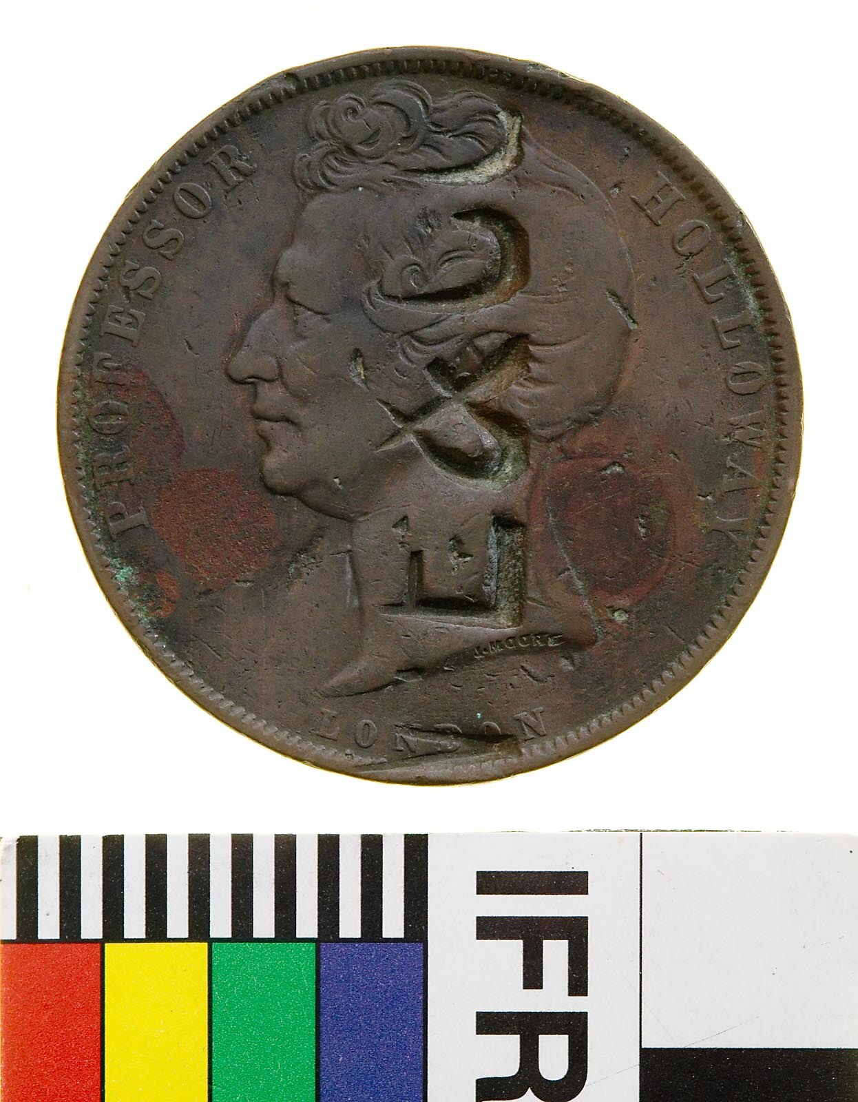 Head of Professor Holloway facing left with J. MOORE (the maker's name) incuse on neck truncation; around, PROFESSOR HOLLOWAY; below, LONDON, surcharged W.E & CO